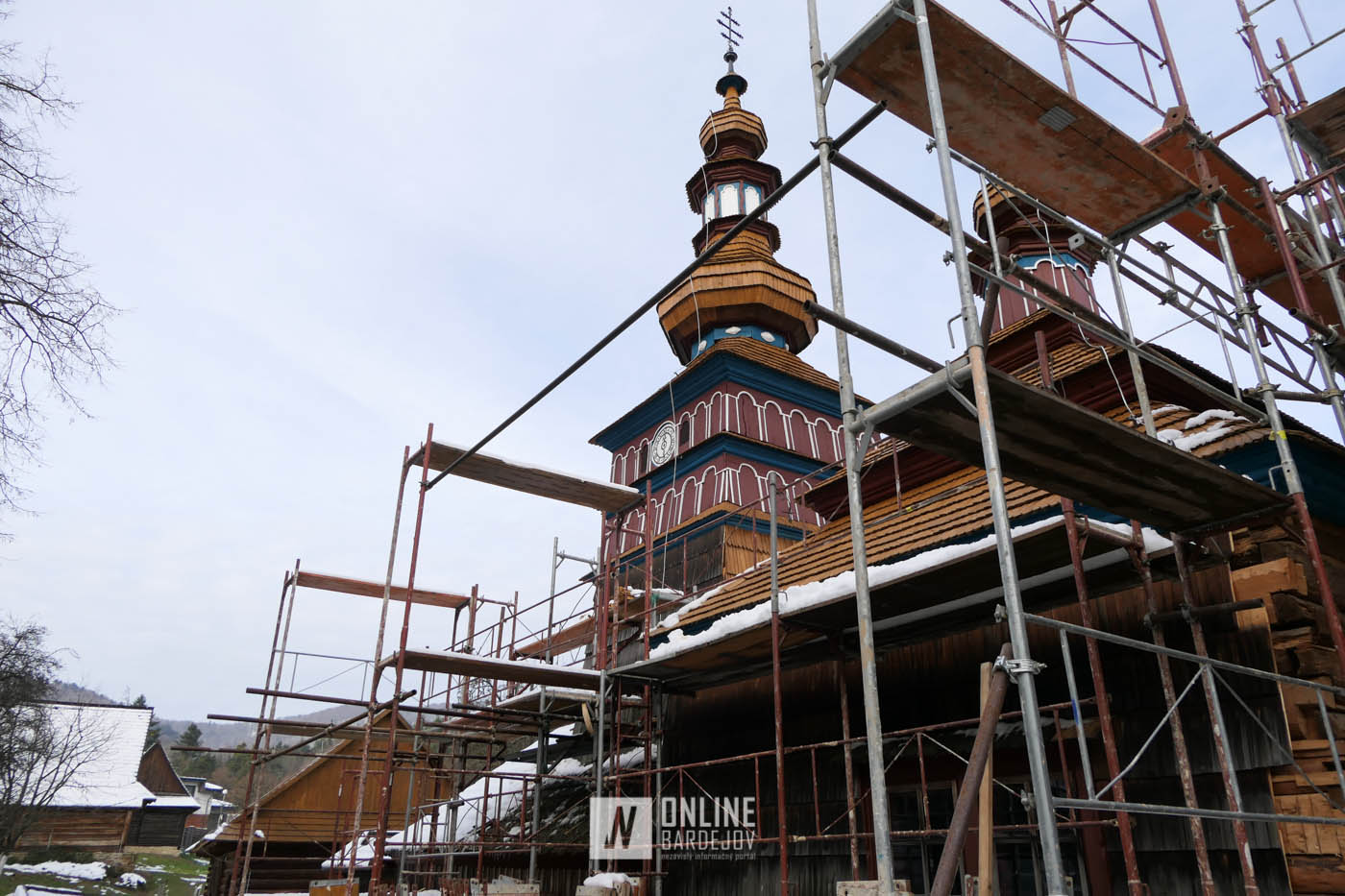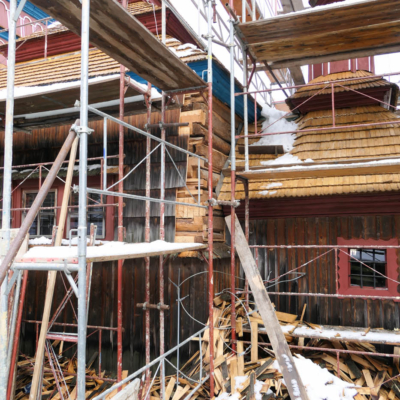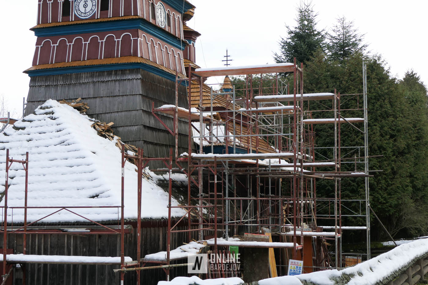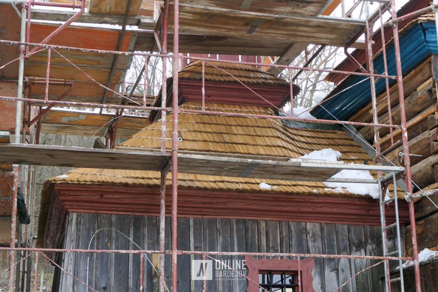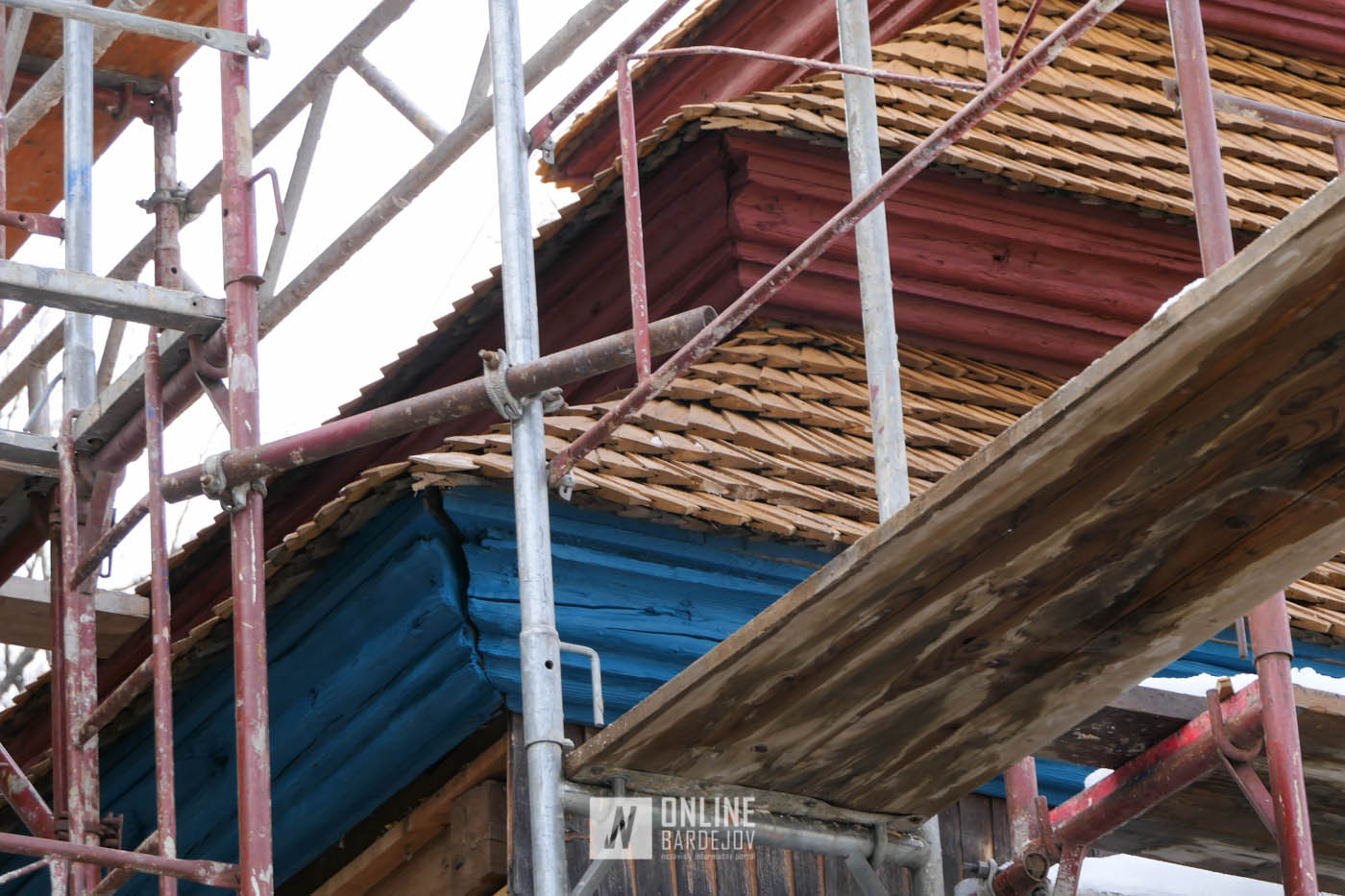Zachytili sme postup rekonštrukčných prác v novembri 2025 na Gréckokatolíckom drevenom Kostole Ochrany Presvätej Bohorodičky z roku 1730, ktorý bol do skanzenu premiestnený v roku 1931. Na fotografiách vidieť výmenu najviac poškodených zrubových častí nosnej konštrukcie pod šindľovým opláštením a strechu, ktorá bola naozaj v dezolátnom stave. V chráme je jeden z najkrajších a najzachovalejších ikonostasov z 18. storočia. Exteriér chrámu bol naposledy zreštaurovaný v roku 2006.