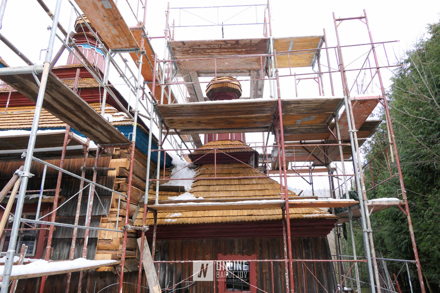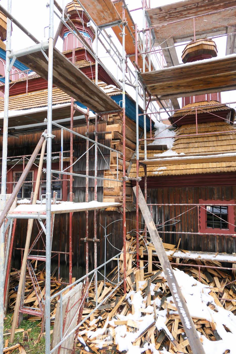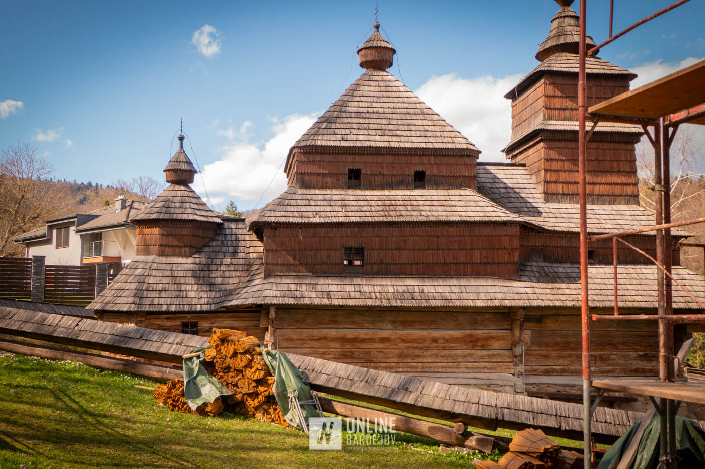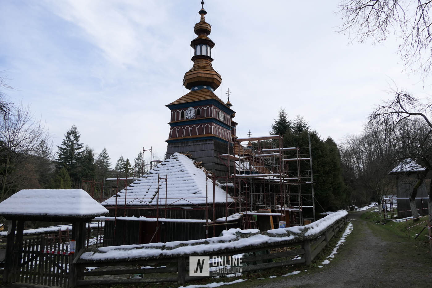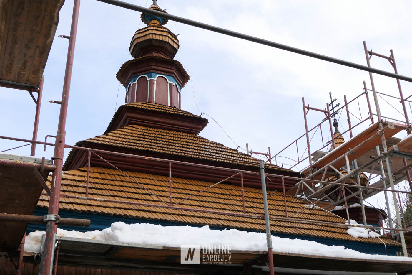 Zachytili sme postup rekonštrukčných prác v novembri 2025 na Gréckokatolíckom drevenom Kostole Ochrany Presvätej Bohorodičky z roku 1730, ktorý bol do skanzenu premiestnený v roku 1931. Na fotografiách vidieť výmenu najviac poškodených zrubových častí nosnej konštrukcie pod šindľovým opláštením a strechu, ktorá bola naozaj v dezolátnom stave. V chráme je jeden z najkrajších a najzachovalejších ikonostasov z 18. storočia. Exteriér chrámu bol naposledy zreštaurovaný v roku 2006.
